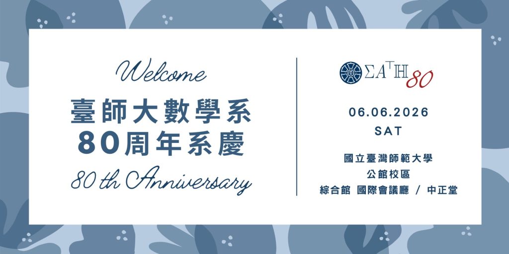 數學系創系80周年系友教學技能經驗分享暨聯誼會 流程 8:30-9:00 報到 (綜合館-國際會議廳) 9:00-9:20 Opening 開幕 9:20-9:50 Session1 演講 9:50-10:20 Session2 演講 10:20-10:30 Break 休息 10:30-11:00 Session3 演講 11:00-12:00 系友會時間 12:00-14:00 暫定辦桌 (中正堂) 14:00-15:00 自由討論時間 15:00- 校園巡禮賦歸 「聯絡人」招募中https://forms.gle/uKYWtdUjL8NfC9KZ8