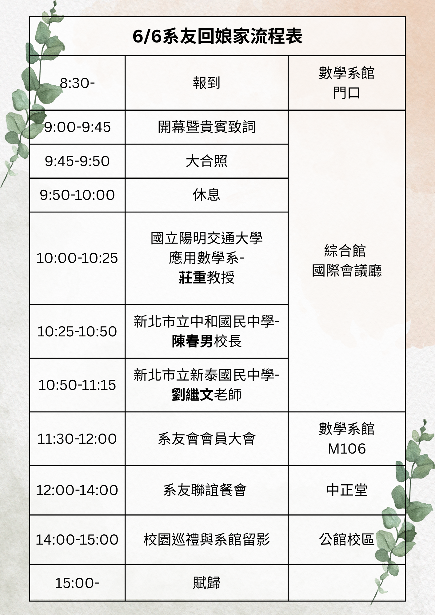 系友回娘家 歲月流轉,師大數學系已走過八十載風華。在這凝聚情誼與榮耀的珍貴時刻,我們熱切期盼能邀您共襄盛舉。感念您長年在數學領域的執著耕耘,無論是講台上的春風化雨,抑或產學界的卓越成就,皆是我們引以為傲的風景。您的歸來,不僅是對本系最溫暖的肯定,那份風範更將為年輕學子帶來無盡的鼓舞與指引 。 聯絡/報名資訊 議程 打卡點 舊時光 「聯絡人」招募中https://forms.gle/uKYWtdUjL8NfC9KZ8