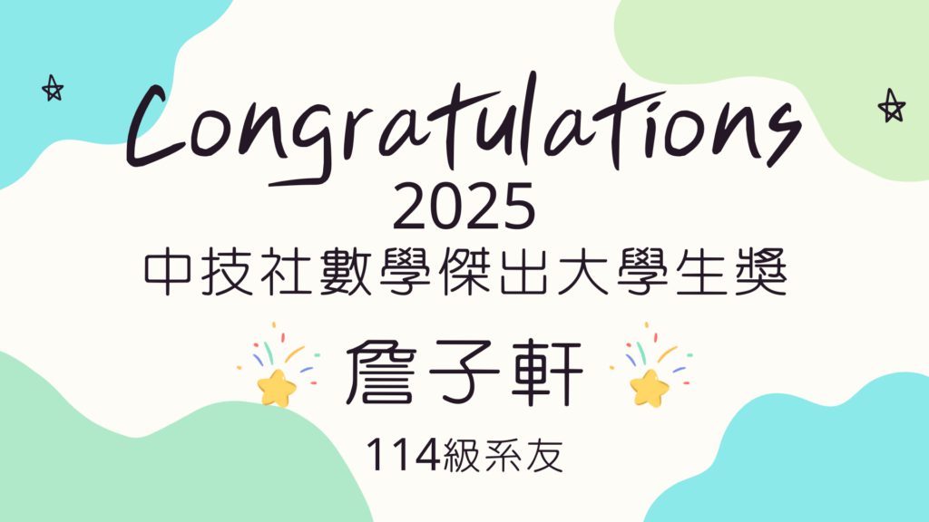 [榮譽] 恭賀本系114級系友詹子軒獲得2025年中技社數學傑出大學生獎 Post author:温湘婷 Post published:2025-11-24 Post last modified:2025-11-24 恭賀本系114級系友詹子軒獲得2025年中技社數學傑出大學生獎!