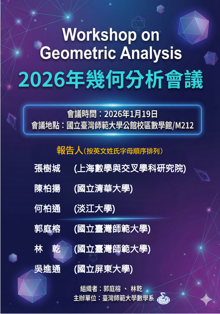 [活動公告] Workshop on Geometric Analysis 2026年幾何分析會議 Post author:楊筱萱 Post published:2025-12-23 Post last modified:2025-12-23 會議時間: 2026年1月19日會議地點: 國立臺灣師範大學公館校區數學館 M212