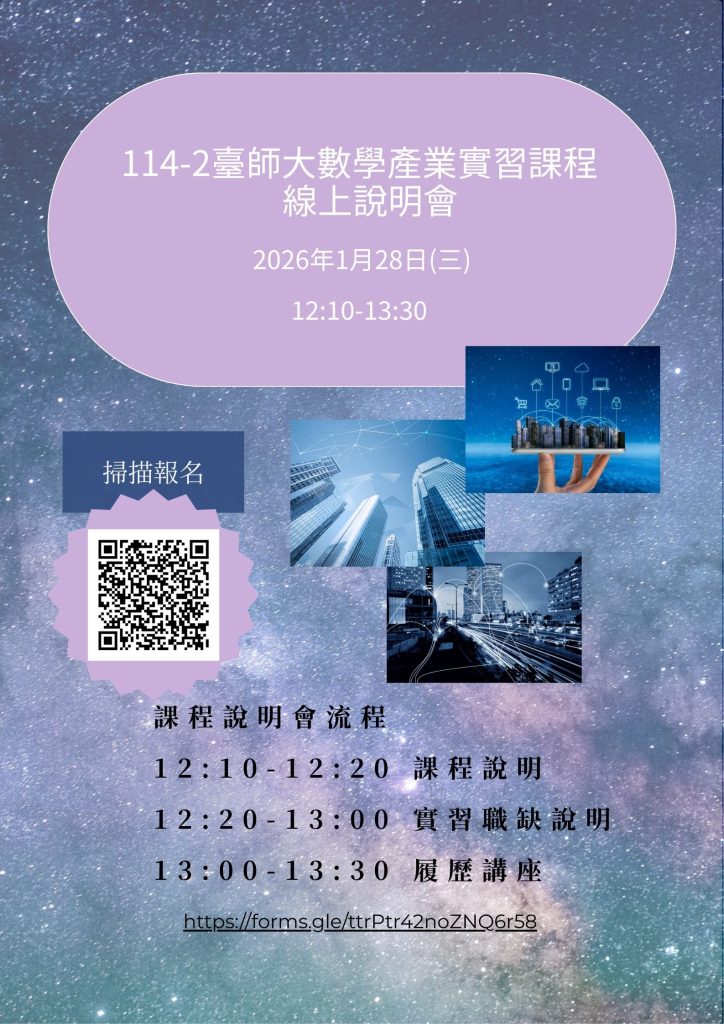 [活動公告] 【1月28日】114-2臺師大數學產業實習課程線上說明會 Post author:楊筱萱 Post published:2026-01-05 Post last modified:2026-01-05 📣【數學產業實習說明會】實習媒合 × 職涯方向 × 申請準備想把你在課堂學到的邏輯、模型、資料分析與程式能力,轉成職場可用的實戰經驗嗎?歡迎報名「數學產業實習說明會」,協助你用更有效率的方式踏出職涯探索的第一步。課程網頁https://meet.google.com/tfh-caty-xtv📅 時間:2026年1月28日(三)12:10-13:30📍 地點:線上連結/https://meet.google.com/tfh-caty-xtv👥 對象:對產業實習有興趣之同學📝 報名:https://forms.gle/mjQVACqHQSAfyfmw8