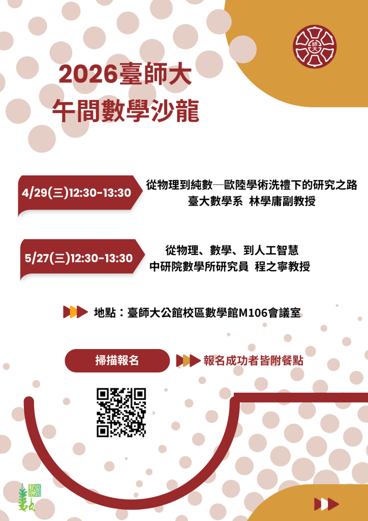 [數學沙龍] 【4月29日】林學庸 / 【5月27日】程之寧