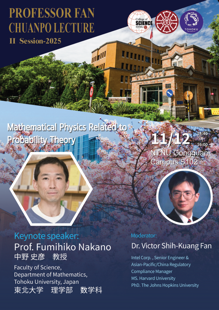 [Professor Fan Chuanpo Lecture] 【Nov 12】Fumihiko Nakano / Mathematical Physics Related to Probability Theory Post author:郭素妙 Post published:2025-10-16 Post last modified:2025-10-16 Professor Fan Chuanpo Lecture II Session 2025Time: Nov. 12 (Wed.) 14:40-16:00Venue: S102, Gongguan Campus, NTNUSpeaker: Prof. Fumihiko Nakano (Faculty of Science, Department of Mathematics, Tohoku University, Japan)